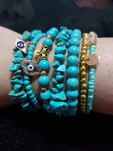 The Turquoise Harmony bracelet by GolbalJew is a handcrafted beach bracelet made of natural stone and turquoise , combining classic style with a unisex design. At approximately 19 cm in length, it fits both women and men and can be combined with a variety of outfits.